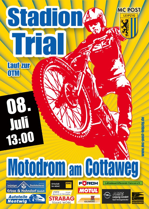 Wir möchten hiermit unsere Motorrad-Trial-Hauptveranstaltung des Jahres 2023 ausschreiben: ADAC Stadion Trial im Motodrom am Cottaweg am Samstag 08.07.2023. Es handelt sich dabei um den 7. Lauf zur Ostdeutschen Trialmeisterschaft und um einen Lauf zur Sächsischen Trialmeisterschaft.