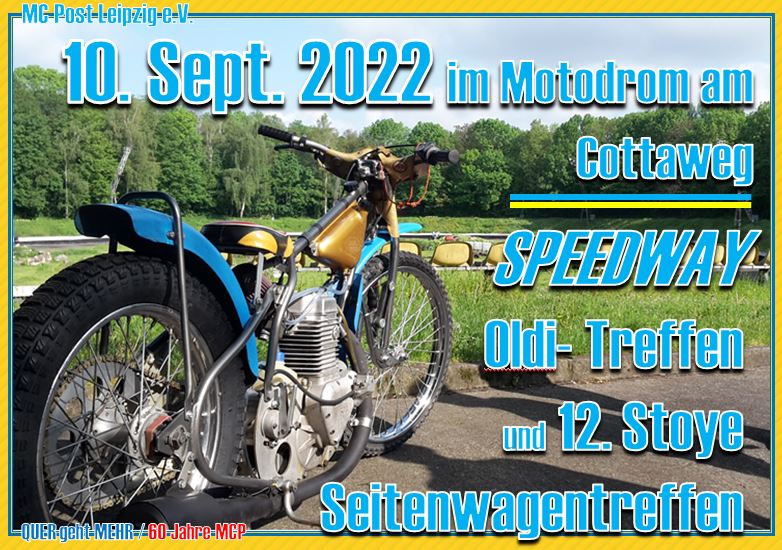 Unser Speedway Oldi Herbsttreffen mit dem Treffen unserer Stoye Seitenwagen Freunde zu verbinden, ist eine super Sache. Wir freuen uns, allen Freunden des Speedway-Sports und der historischen Leipziger Seitenwagenmaschinen diesen Leckerbissen in entspannter Atmosphäre servieren zu können. Wir erwarten bei gutem Wetter reichlich Teilnehmer. Kommt vorbei, es lohnt sich wirklich.